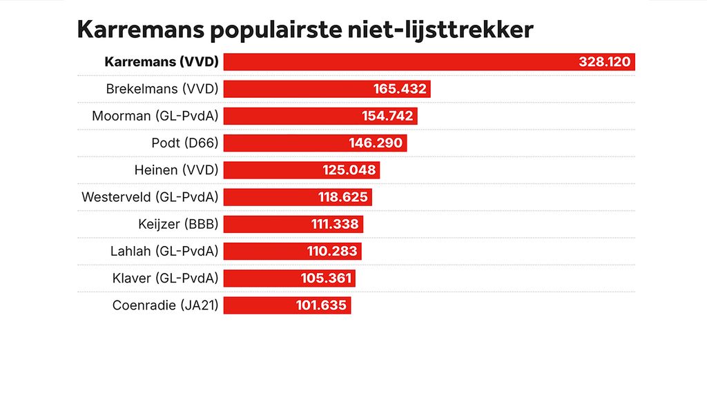 Bij de VVD was het juist een man die goed scoorde: Vincent Karremans, die ook zeer zichtbaar was in de media, kreeg 328.000 voorkeurstemmen. Daarmee was de demissionair minister van Economische Zaken bij deze verkiezingen de niet-lijsttrekker met de meeste stemmen. Ook twee andere VVD-ministers, Eelco Heinen en Ruben Brekelmans, deden het goed.