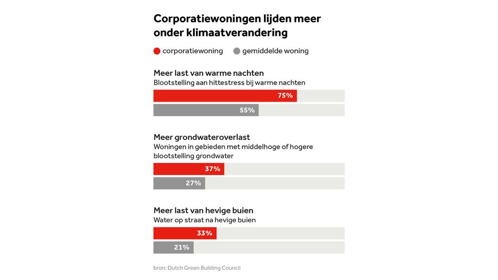 Sociale huurwoningen van woningcorporaties krijgen meer te maken met de effecten van klimaatverandering dan de gemiddelde woning. Zo krijgen bewoners van deze huizen vaker last van hitte of overlast door grondwater. Dat blijkt uit een analyse van 830.000 sociale huurwoningen van 53 woningcorporaties, uitgevoerd door stichting Dutch Green Building Council.