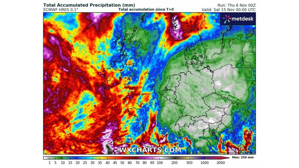 WxChartsOp deze kaart zie je de verwachte hoeveelheid regen (in millimeter) tot en met volgende week vrijdag. Wit en groen betekent vrijwel droog weer.
