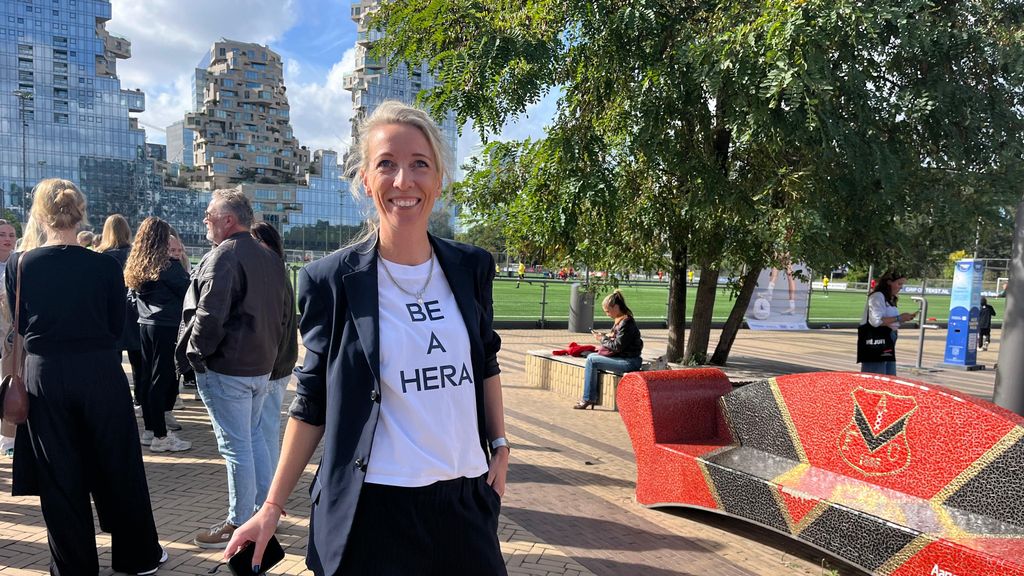Even terug naar het uur voor de wedstrijd. “Ik ben totaal excited”, zegt Visser bij de ingang. Ze draagt een Hera-shirt dat ze last-minute heeft laten maken voor de fanshop. Het is allemaal zo snel gegaan dat ze alleen nog wedstrijdshirts hebben voor het team. “Misschien moeten we deze er maar inhouden. Is best goed gelukt, toch?”