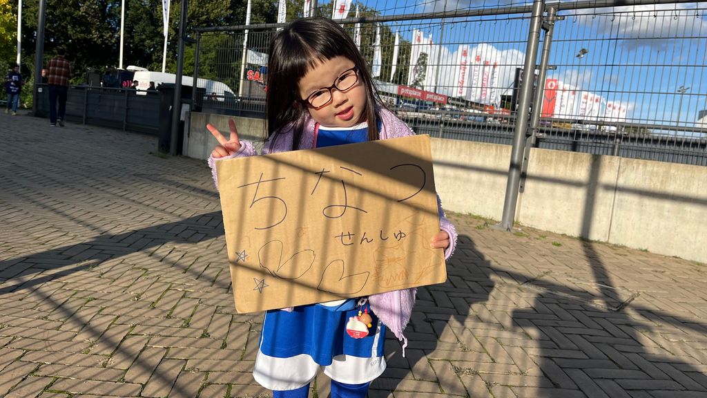 De 4-jarige Miyu wil zeker nog eens gaan, zegt haar moeder. Miyu houdt een kartonnen bord omhoog met daarop ‘Hera United’ in het Japans. Ze is hier vanwege de Japanse speelster Chinatsu Kira.