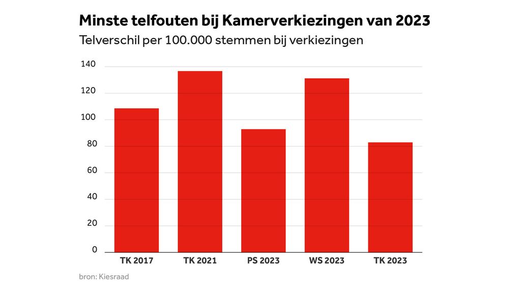 Volgens de Kiesraad was het aantal telfouten de afgelopen jaren het minst bij de Tweede Kamerverkiezingen van 2023, dat kwam toen uit op ruim 8600 stemmen. Dat aantal is bij lange na niet genoeg voor een zetel: