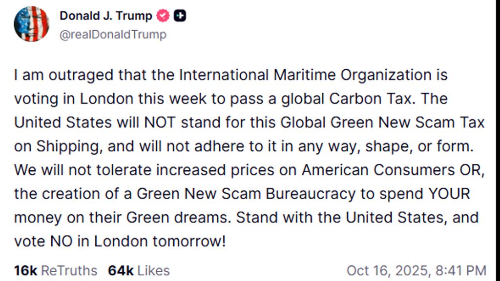 Screenshot Truth Social.Post van president Donald Trump over de verduurzamingsplannen van de IMO op Truth Social