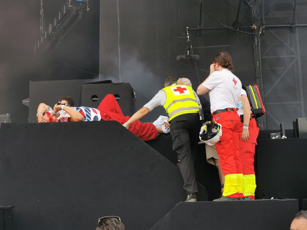 De zin ”Ik kan nauwelijks op mijn benen staan” uit ”Noodgeval” was nooit toepasselijker. Goldband-frontman Boaz Kok belandde tijdens een verkeerde sprong niet ín, maar tussen het publiek en de barrières. Auw. De EHBO was gelukkig snel ter plaatse en behandelde zijn been, terwijl de beste man al liggend doorzong.