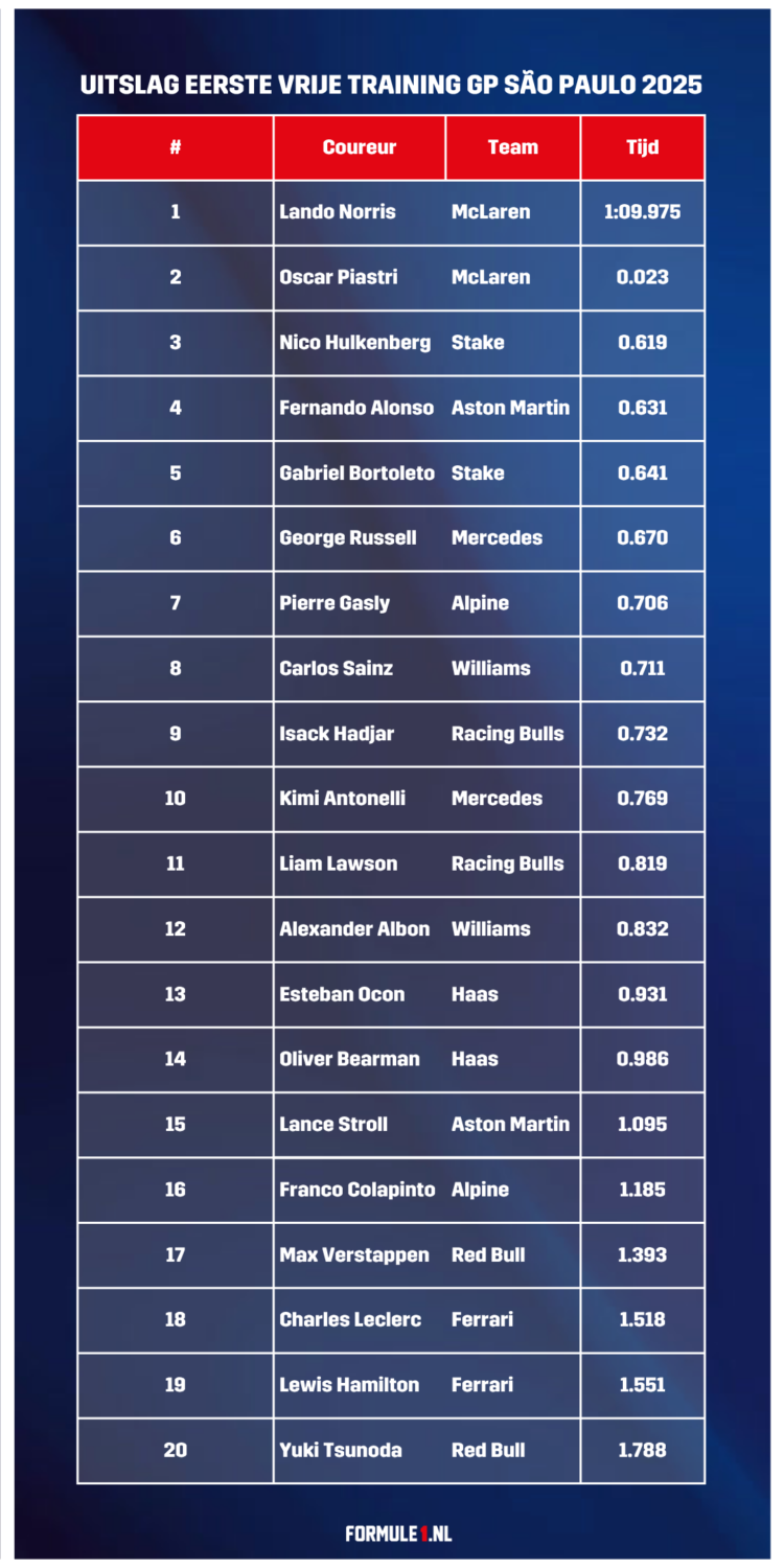Lando Norris is de snelste deze sessie! Oscar Piastri noteert de tweede tijd en Nico Hülkenberg maakt de top drie compleet. Max Verstappen rijdt deze sessie met een andere strategie en noteert zijn snelste rondetijd op de harde band. De Nederlander eindigt op P17. Bekijk hieronder de volledige uitslag van de eerste vrije training tijdens de GP van São Paulo 2025.