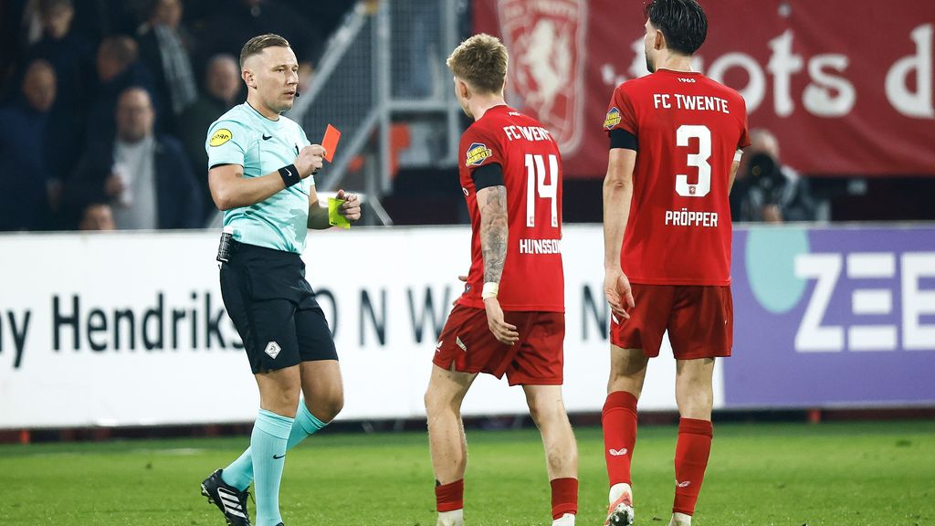 Scheidsrechter Martijn Vos zag er een slaande beweging in en stuurden de Telstar-aanvaller met rood uit het veld. Het Twentse slotoffensief had weinig om het lijf.