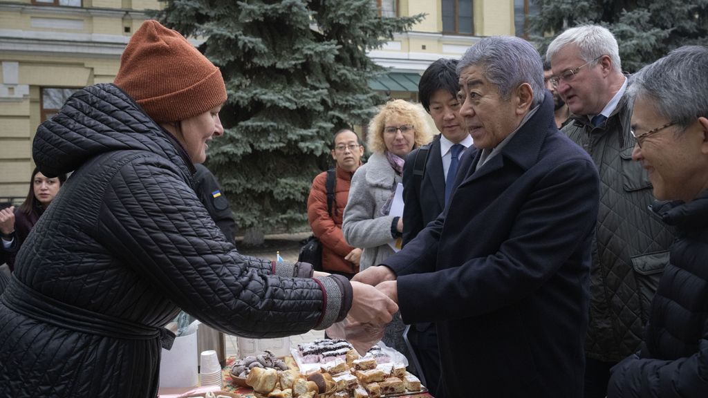 APDe Japanse oud-minister Iwaya koopt gebak in Kyiv. Het geld is bedoeld voor het Oekraïense leger (foto uit 2024)