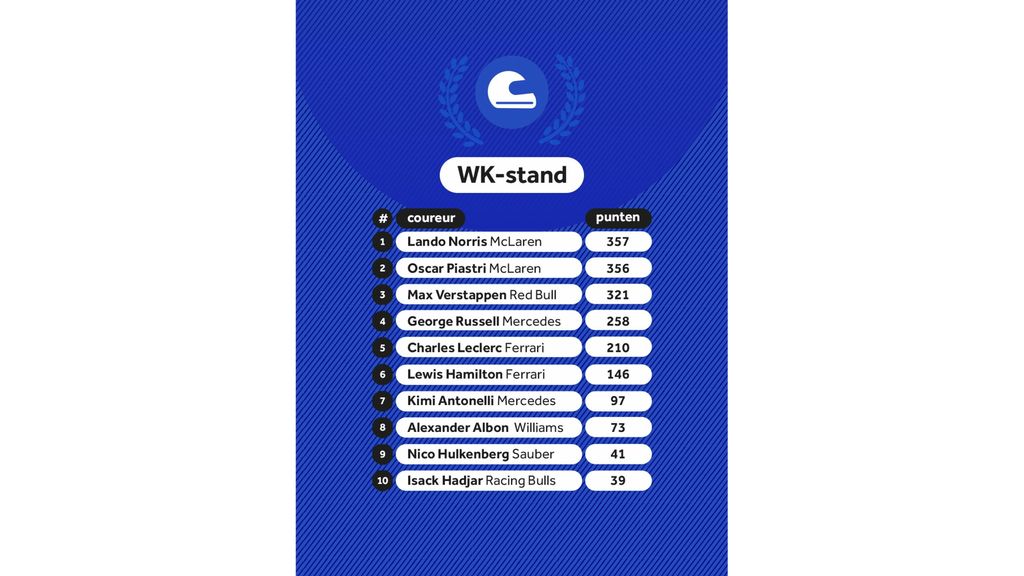 Daarna volgden crashes in de kwalificatie en wedstrijd in Bakoe, een desastreus weekend voor Piastri. Ook in Singapore (vierde), Texas (vijfde) en Mexico-Stad (vijfde) stond de voormalig WK-leider niet op het podium. Intussen is Norris de Australiër voorbij gegaan in de WK-stand. Het verschil tussen de McLaren-coureurs bedraagt één punt.