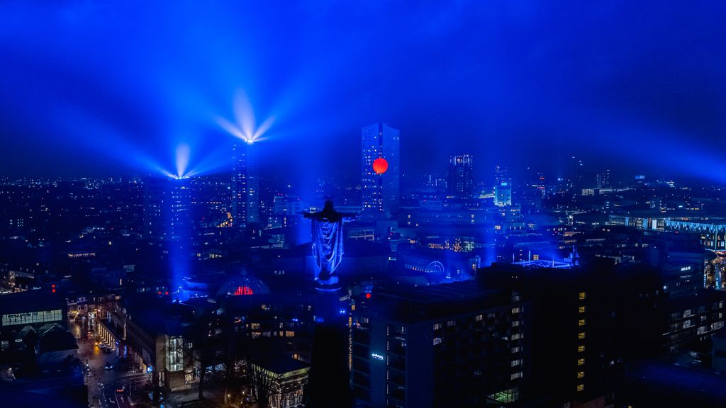 In het blauwe licht waren ook duizend rode ballonnen te zien. “Met het licht wilden we ondanks corona de hele stad verbinden. De ballonnen stelden rode harten voor”, zegt Rademakers.