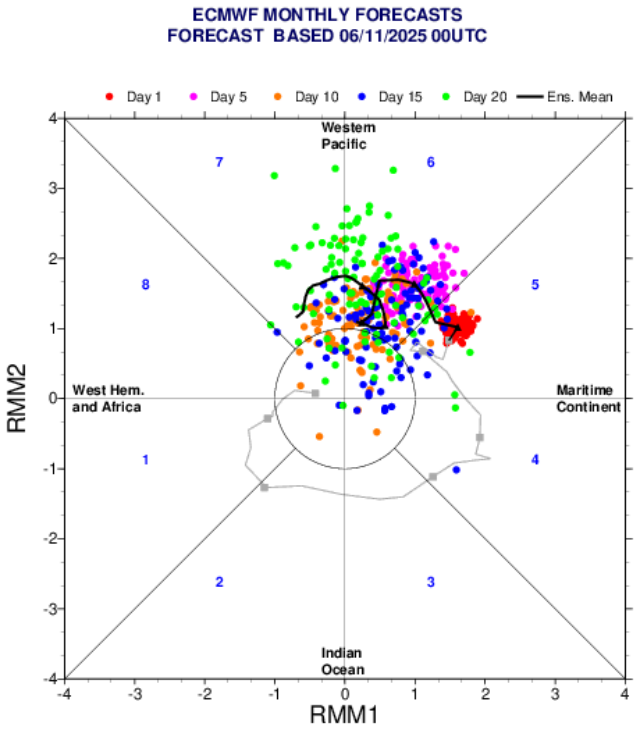 De laatste uitdraai van de MJO-index vertelt ons dat we aankomen in een fase 6-7. Dit betekent dat er een grote kans is op drukstijgingen in het noorden. Deze fases hebben we nodig als we de kansen op koudere temperaturen groter willen zien worden. Door deze drukstijging kan een hogedrukgebied ontstaan in het noorden en zou de luchtstroming oostelijk kunnen worden waardoor de temperaturen kunnen dalen. Momenteel zien we in de kaarten vergelijkbare scenario’s, maar dit is nog vingerdik kijken. Vaak speelt de positie van lagedrukgebieden in het zuiden dan een grote rol in het aanvoeren van koude lucht.