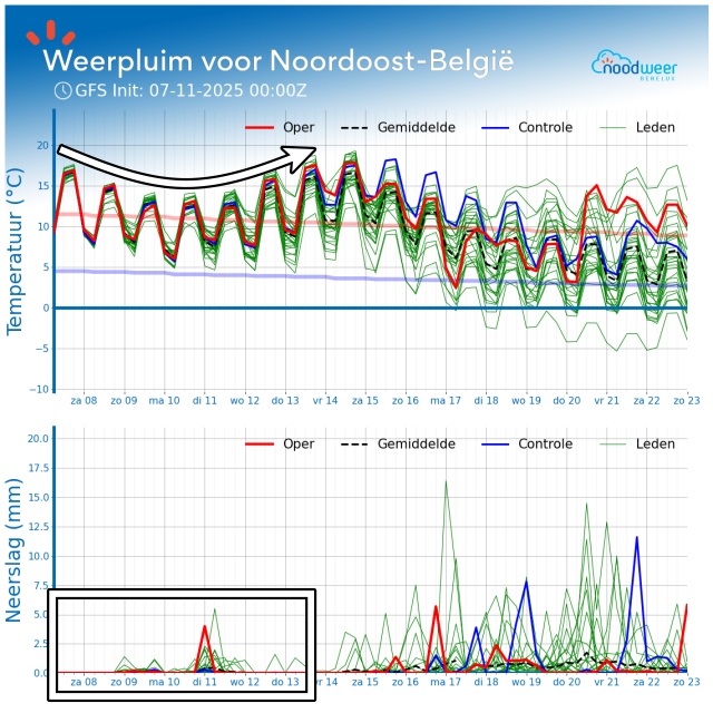 Als we verder in de weerpluim kijken, zien we dat we na het weekend van 14 november dalende temperaturen krijgen. Wil dit dan zeggen dat we afscheid nemen van het zacht weer? Wel, de weermodellen geven signalen op drukstijgingen tussen Groenland en IJsland waardoor de kansen op koudere temperaturen vergroten, maar dit is zeker geen garantie. Het is de onzekerheid in de weermodellen die toeneemt waardoor we in de weerpluimen vaak zien dat de gemiddelde temperatuur op lange termijn stabiliseert naar de langjarige gemiddelden.