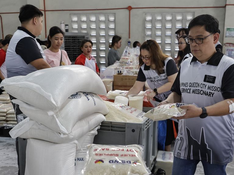 EPAVrijwilligers en overheidsmedewerkers pakken voedselpakketten in voor de getroffen regio’s