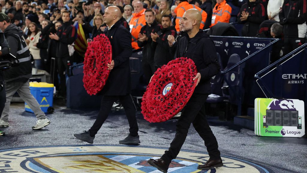AFPTrainers Arne Slot en Pep Guardiola dragen een erekrans ter herdenking van de slachtoffers van de Eerste Wereldoorlog.