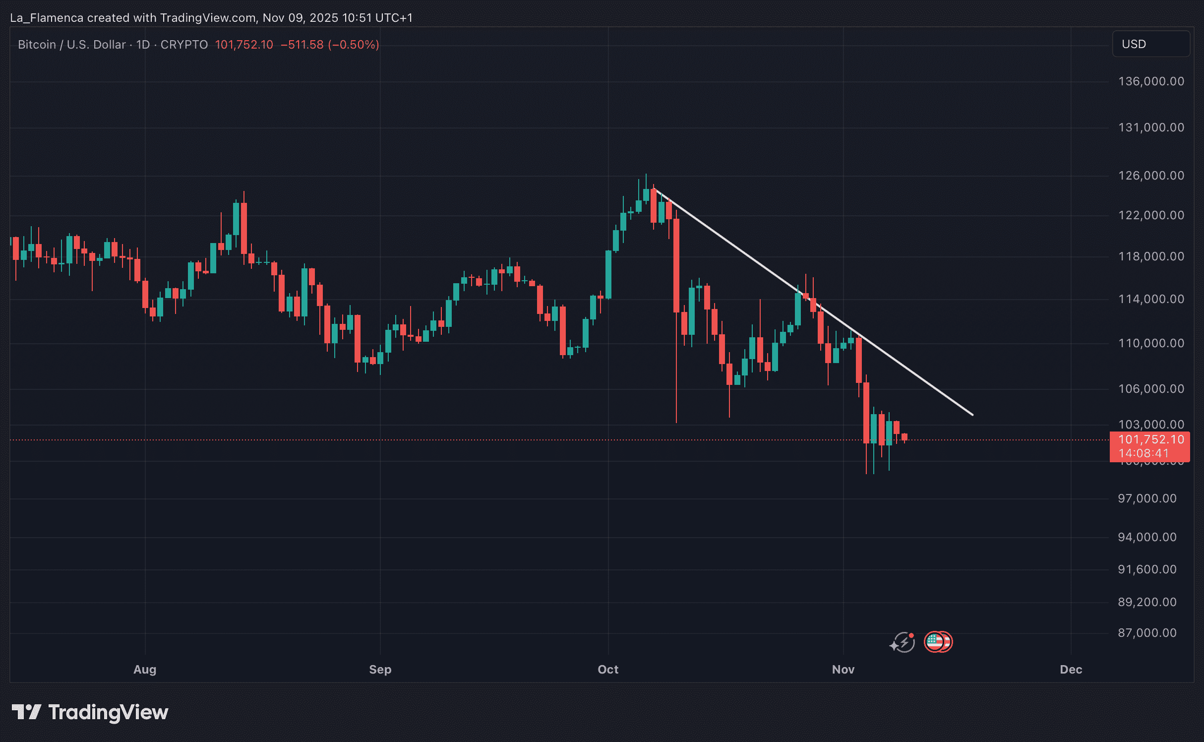 BTC/USD dagelijkse koersgrafiek met neerwaartse trend. Bron: La_Flamenca via TradingView