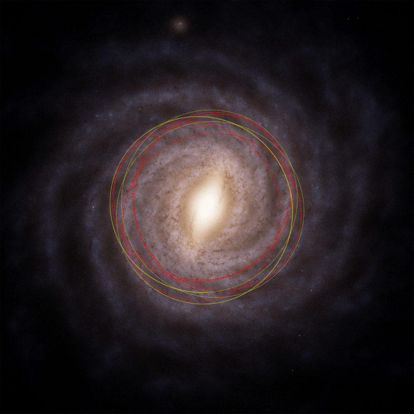 De geplotte banen van 3I/ATLAS en ons zonnestelsel in ons sterrenstelsel (van bovenaf bezien). De baan van onze zon is weergegeven in gele stippellijn, die van de komeet in rood. Begrepen kan worden dat de komeet een excentrischer baan volgt om het centrum van de Melkweg dan ons zonnestelsel zelf. Afbeelding: M. Hopkins/Ōtautahi-Oxford team. Base map: ESA/Gaia/DPAC, Stefan Payne-Wardenaar