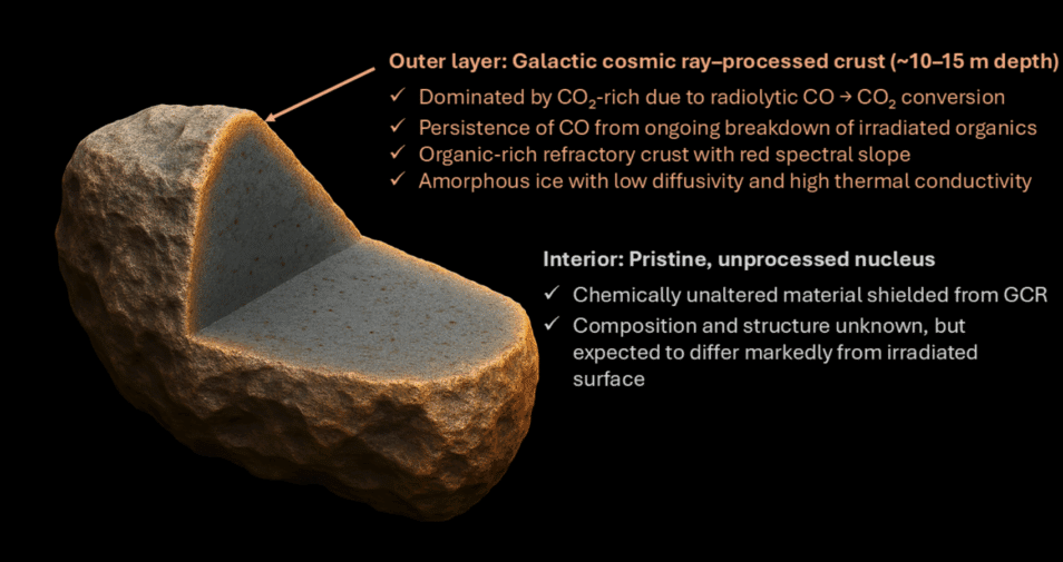 Schematische weergave van de naar verwachting gelaagde structuur van de kern van 3I/ATLAS, waaruit het effect van galactische kosmische straling blijkt. De buitenste ~15-20 meter is verrijkt met koolstofdioxide (CO₂) en organisch materiaal, terwijl de ongerepte, oorspronkelijke samenstelling zich eronder bevindt. Afbeelding: Romain Maggiolo et al., Royal Belgian Institute for Space Aeronomy (BIRA-IASB), Science Systems and Application Inc. Hampton, Nasa Langley Research Center, Hampton, Centre for mathematical Plasma Astrophysics, Heverlee, Belgium. arXiv:2510.26308
