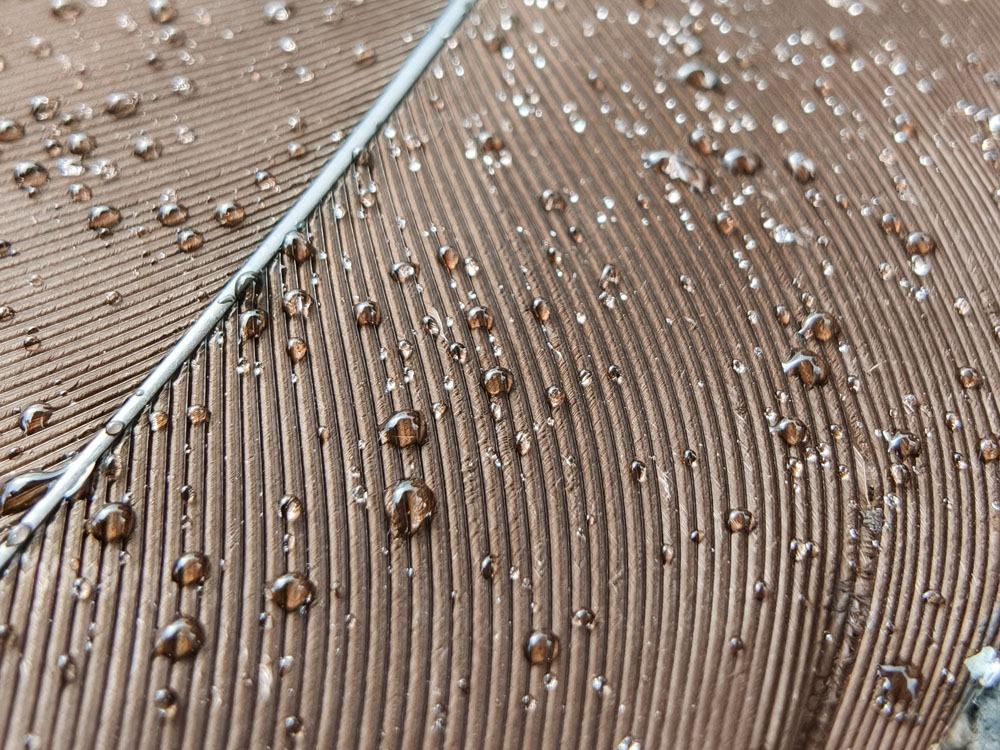 Persoonlijk word ik altijd erg blij als ik ook goede close-up of macro foto’s kan maken met mijn telefoon. Ik kom toch vaak mooie bloemen of andere onderwerpen tegen waar ik even snel een foto van wil maken. Zo ook deze veer met regendruppels erop die op de grond lag in de dierentuin.