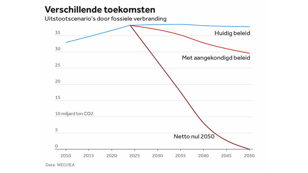 Een wereld die in 2050 nog net zo veel fossiele brandstoffen gebruikt als nu of een toekomst waarbij we fors minderen: het is allebei nog mogelijk. Waar het op uitkomt, hangt af van het klimaatbeleid dat landen gaan voeren, blijkt uit onderzoek van het Internationaal Energie Agentschap (IEA), een organisatie van vooral rijke landen die data verzamelt over energiemarkten.