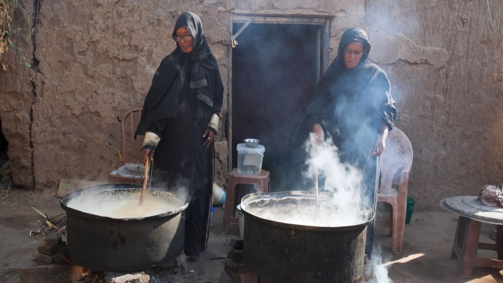 Grote potten staan op het vuur in een buitenwijk van de hoofdstad Khartoem. Vandaag staat er linzensoep op het menu. De 30-jarige Jihad stookt het vuur nog een keer op. In de straat zetten buurtbewoners hun emmertjes en pannetjes alvast in een lange rij voor hun enige maaltijd van de dag.