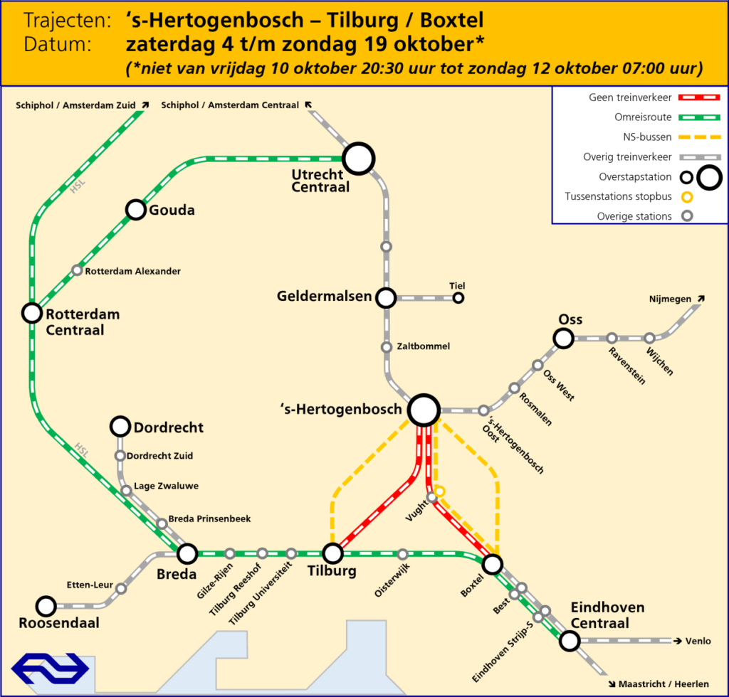 Van 10 tot met 12 oktober ligt ook station Den Bosch eruit. Hiervoor worden extra busdiensten opgezet.