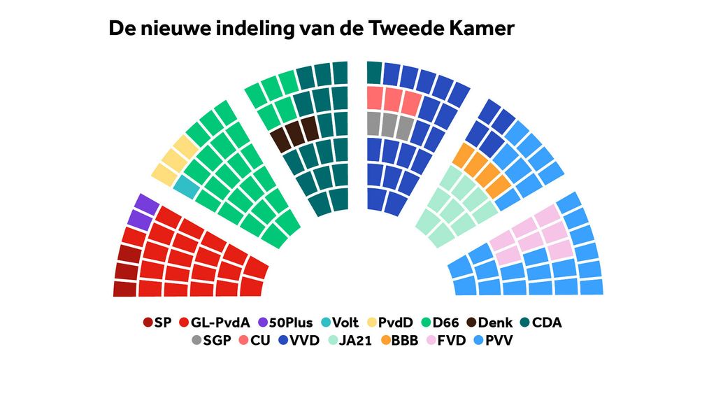 Want de indeling in de plenaire zaal is ook veranderd. De PVV en Forum voor Democratie zitten in het meest rechtervak. 50Plus is met de SP en GroenLinks-PvdA in het uiterst linkse vak geplaatst.
