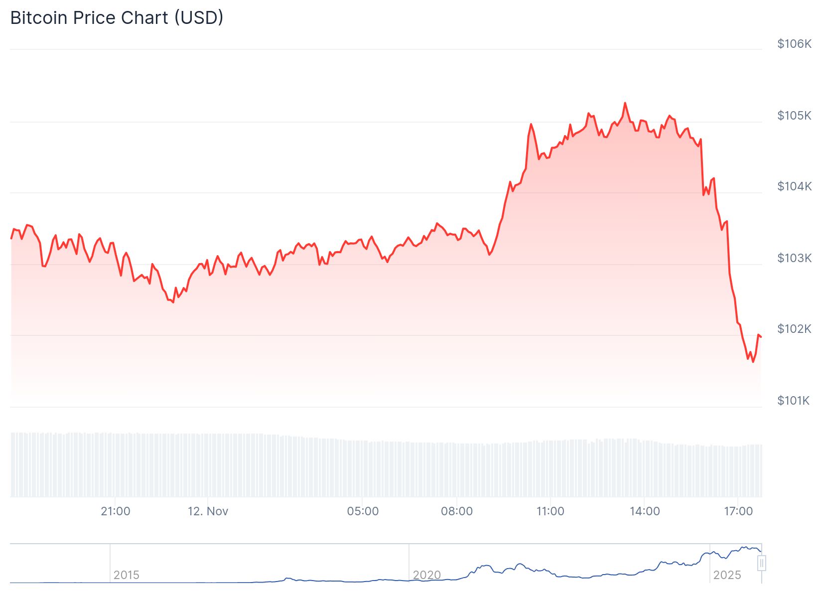 Vanochtend herstelde het weer tot boven de 105.000 dollar, maar het heeft nu opnieuw een draai om de oren gekregen. Iets voor 15:00 uur stond de koers nog op 105.150 dollar, maar twee uur later dook het onder de 102.000 dollar.