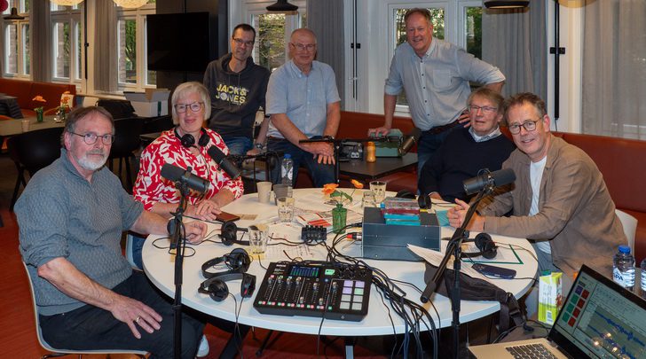 (vlnr) voormalig presentator Peter van den Hout, presentatrice Corine van Dijk, vormgever Andre Kuiper, oud technicus Hans Pasman, initiatiefnemer Rene van de Kolk, voormalig presentator Arie Ribbers en podcast presentator Bert Kranenbarg (KRO/NCRV NPO Radio 5) en vroeger werkzaam bij Omroep Gelderland. (foto Jan van Dalen).