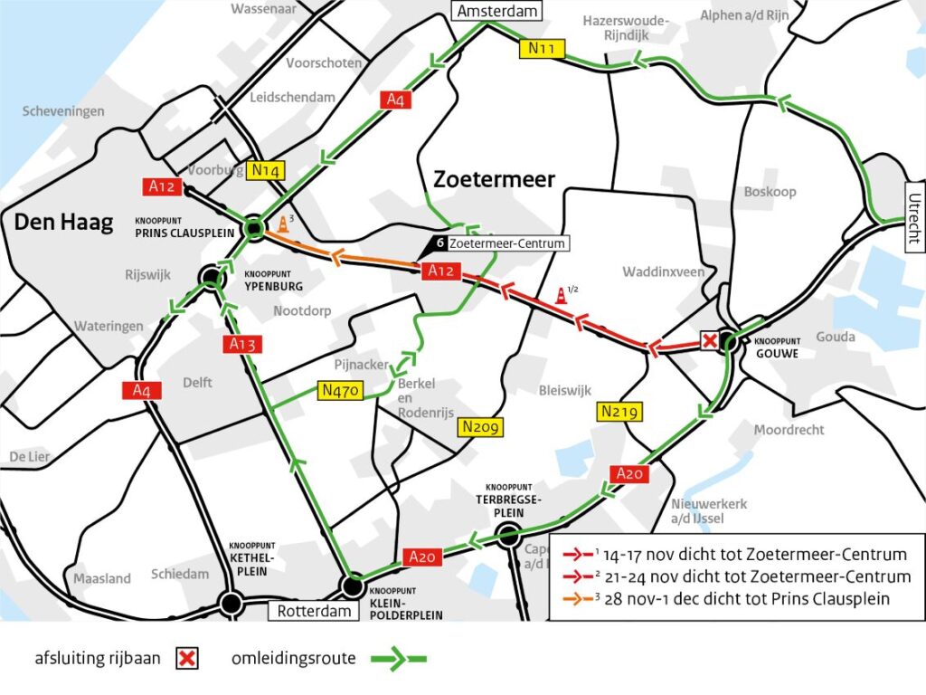 Vrijdag 14 november 22.00 uur tot en met maandag 17 november 5.00 uur is de A12 tussen knooppunt Gouwe en Zoetermeer-Centrum afgesloten