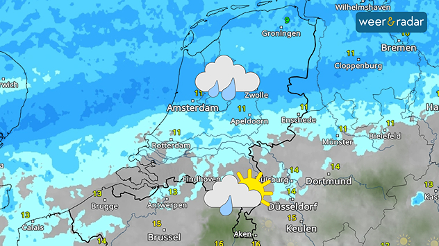 De regen valt precies op de grens van koude en warme lucht. Terwijl vanuit het noorden koelere lucht het land binnenstroomt, blijft de zuidelijke helft van Nederland aan de warme kant van deze luchtmassagrens.