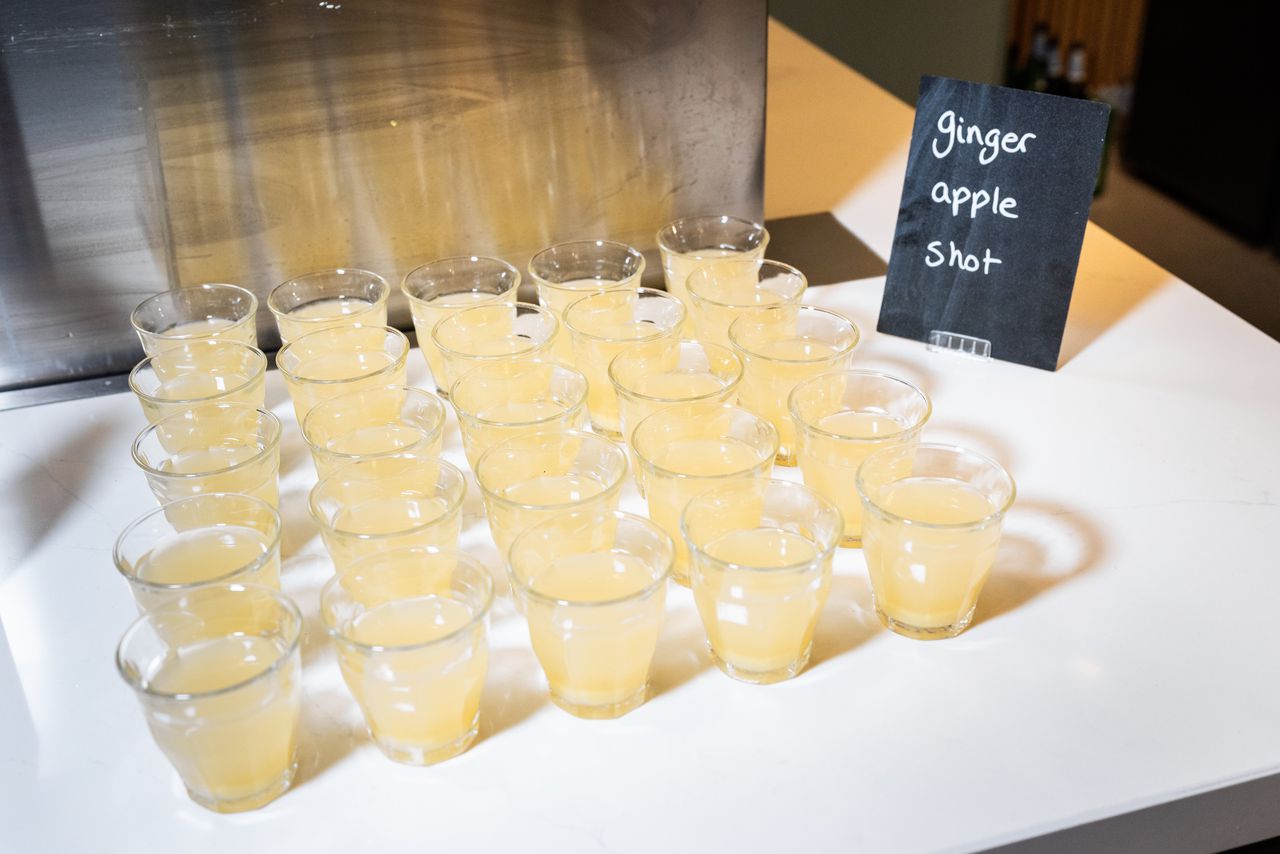 Boven het pistonkoffiezetapparaat hangt een bord met de koffieopties: ‘extraordinary espresso‘ of een ‘companionship cappuccino’. „We lunchen vandaag met poké bowls”, zegt Claire terwijl ze koffieresten in een glimmende designprullenbak veegt. „Ons pand is nogal groot, het koffiezetapparaat staat expres beneden zodat mensen in beweging komen en elkaar hier meeten voor de bonding. Health is voor ons heel belangrijk.”