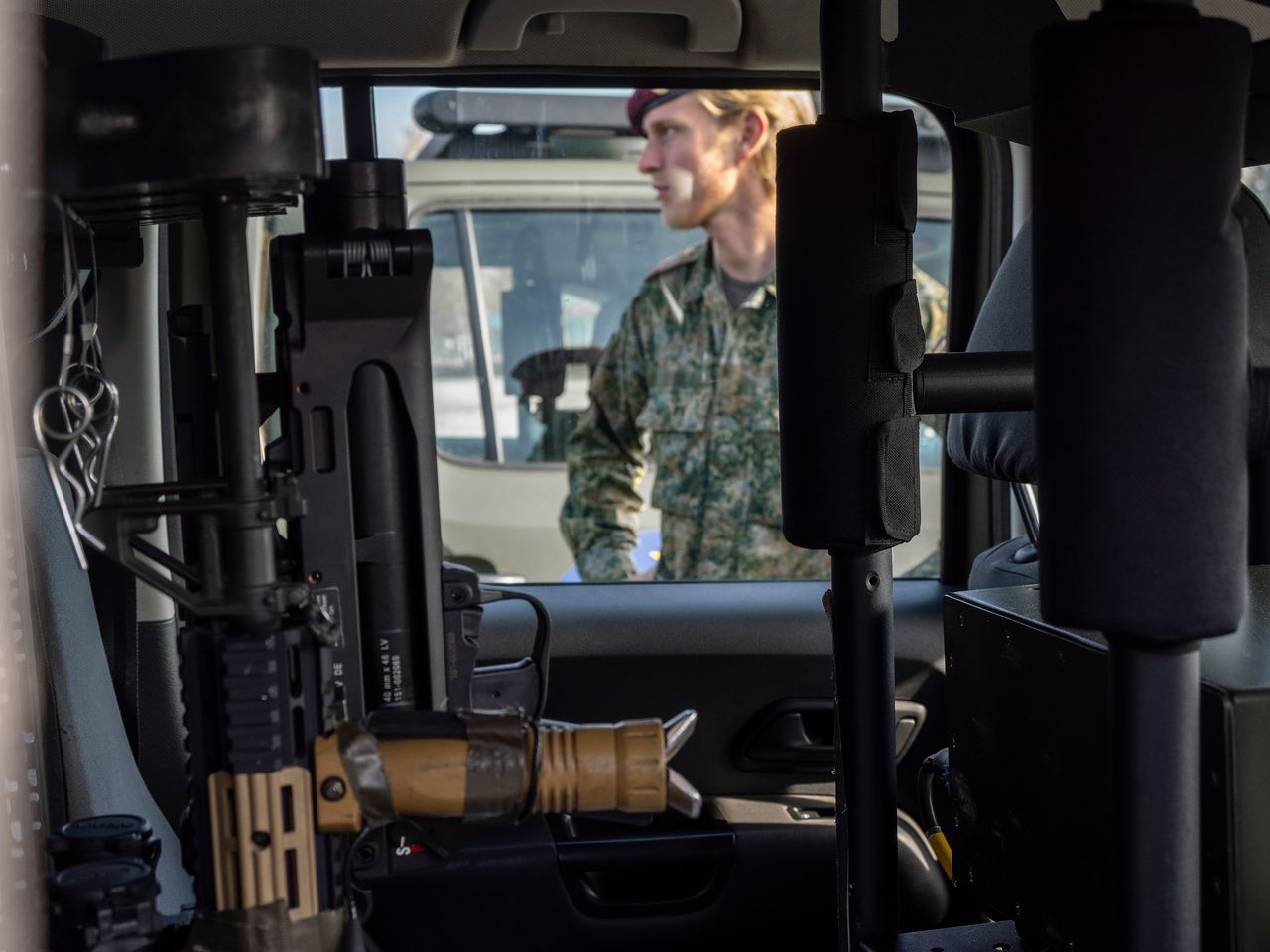 De Nederlanders gaan in Konjic niet zwaarbewapend over straat. De geweren blijven in de voertuigen.