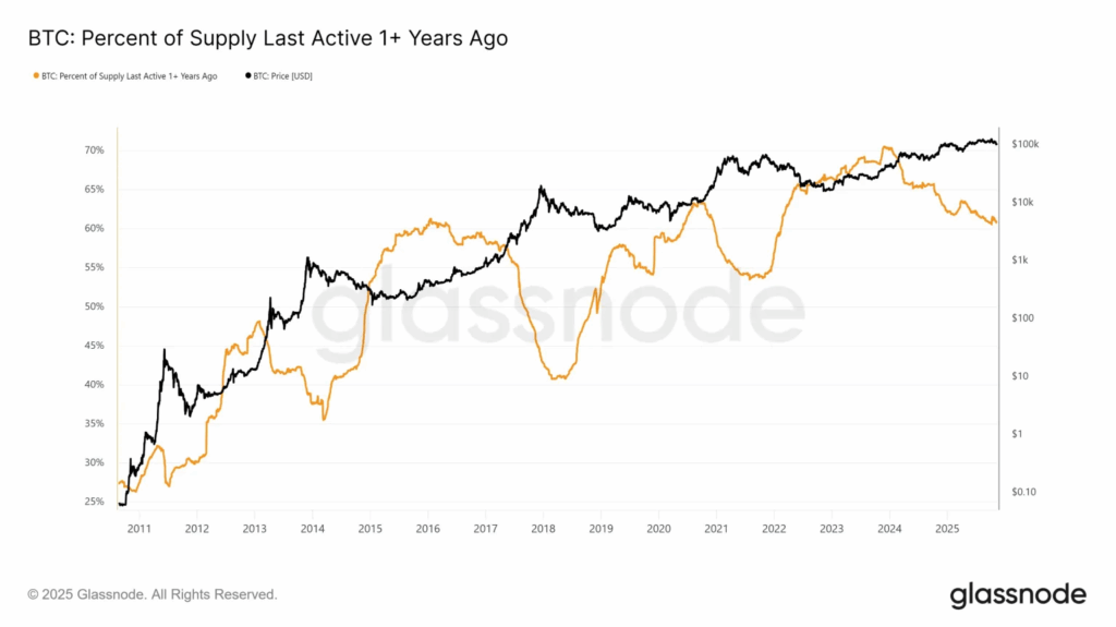 Het percentage munten dat meer dan een jaar niet was aangeraakt, daalt al sinds 2023, maar zonder de heftige bewegingen die we van eerdere bubbels kennen.