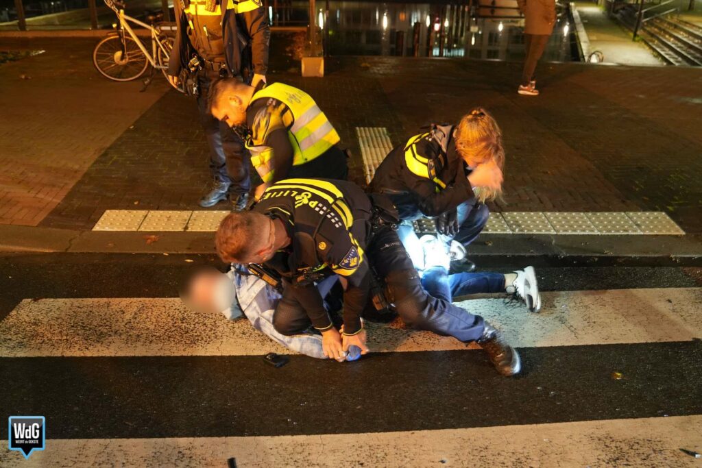 De man maakte een indruk van mogelijke alcohol- en/of drugsgebruik. Hij raakte niet gewond, maar keerde zich op ten duur ook tegen de agenten. Bij zijn aanhouding verzette hij zich en moest hij op de grond worden gewerkt, waarna hij in de boeien werd geslagen. Daarna kwam hij tot rust en is hij overgebracht naar het politiebureau voor nader onderzoek.