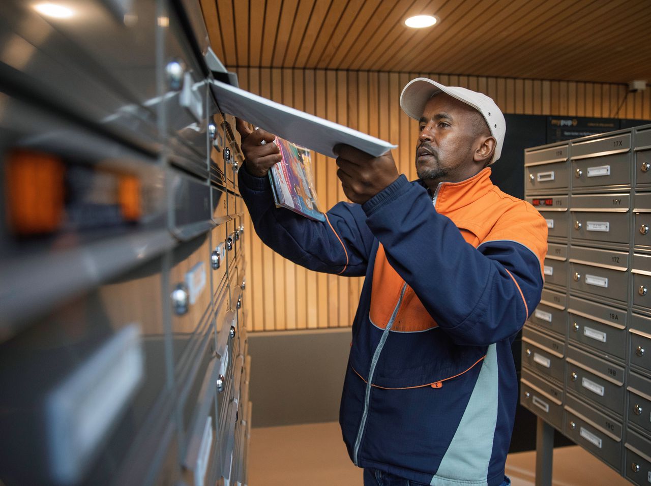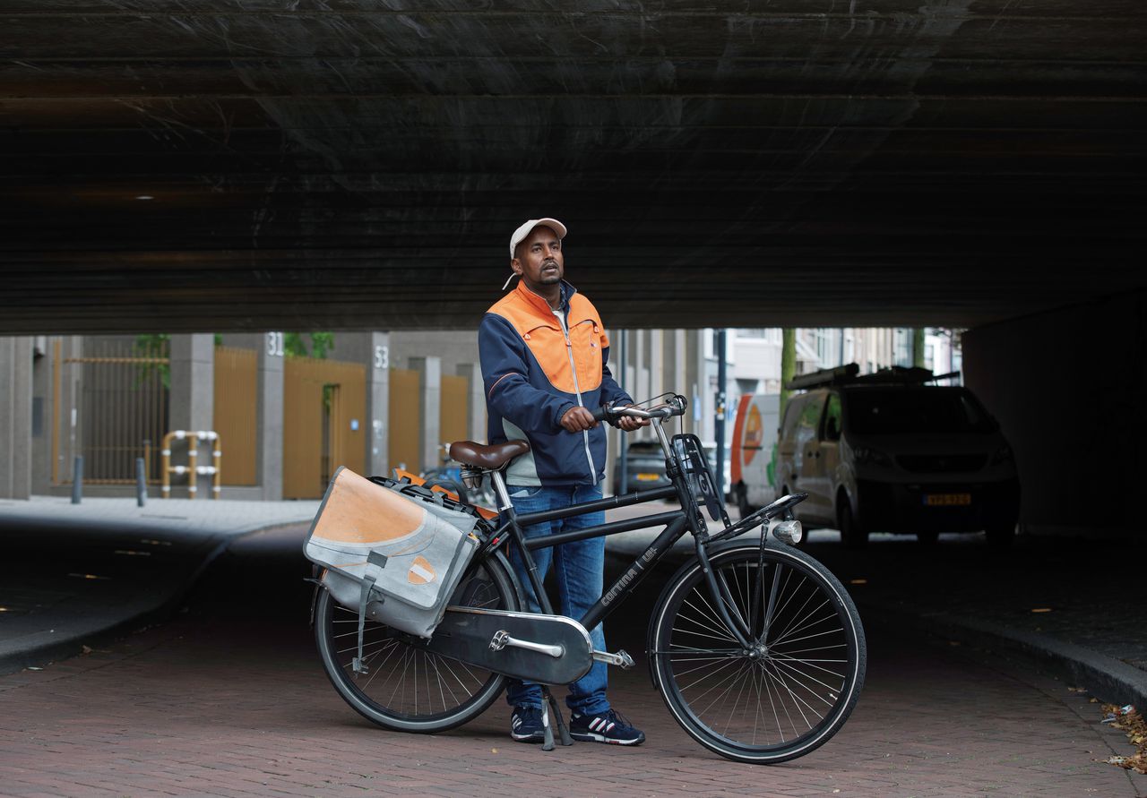 Abdillahi heeft het een en ander zien veranderen, in al die jaren dat hij de post rondbrengt. De fiets werd zwaarder, want zijn wijken werden groter. De koffieautomaat verdween uit de verzamelpunten. Plassen kan er vaak ook niet meer, daarvoor gaat-ie nu naar cafés. En de post dient hij nu uit te serveren als een geoefend kelner, met drie bundels op zijn onderarm in plaats van één. Die bundels zijn in het sorteercentrum al uitgesplitst naar ‘magazines’, ‘brievenbuspakkjes’ en ‘machinepost’, want dat is efficiënter, is het idee. „Maar voor mij zwaarder.”