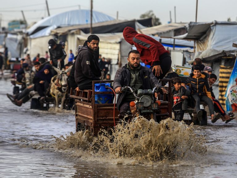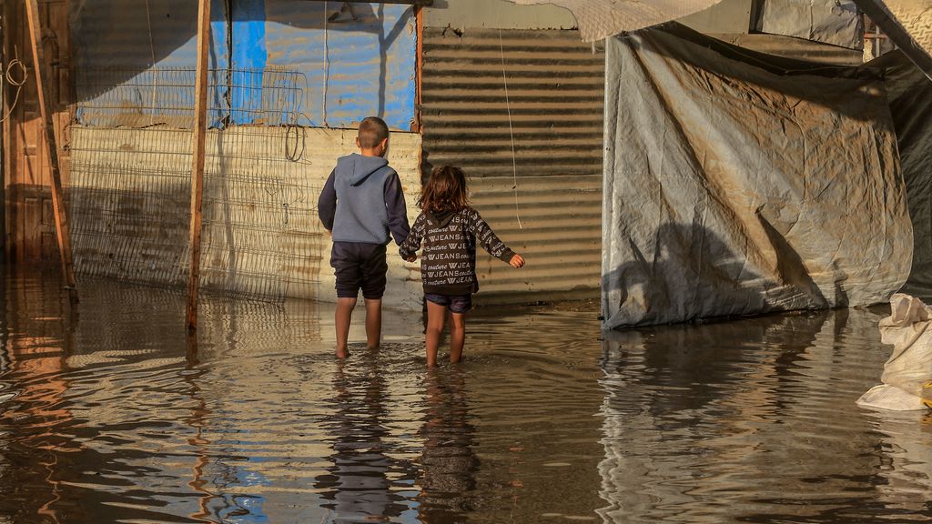 Een groot vluchtelingenkamp in de Gazastrook is voor een deel overstroomd na zware regenval. Tenten en straten staan blank en bezittingen zijn doorweekt. Ook staat er een sterke wind, die de tenten van zeilen en doeken omver blaast.