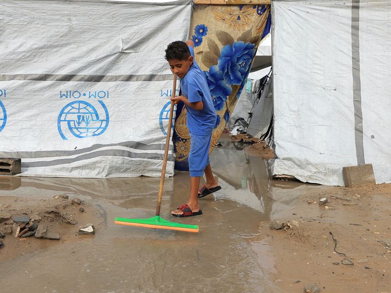 ReutersEen Gazaanse jongen veegt het water uit een tent in Gaza Stad