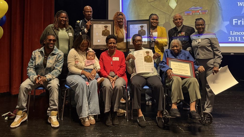 NOSDe familie van Willy F. James Jr., met zus Elizabeth Baldwin die het diploma vasthoudt en Robert Gray rechtsachter in uniform