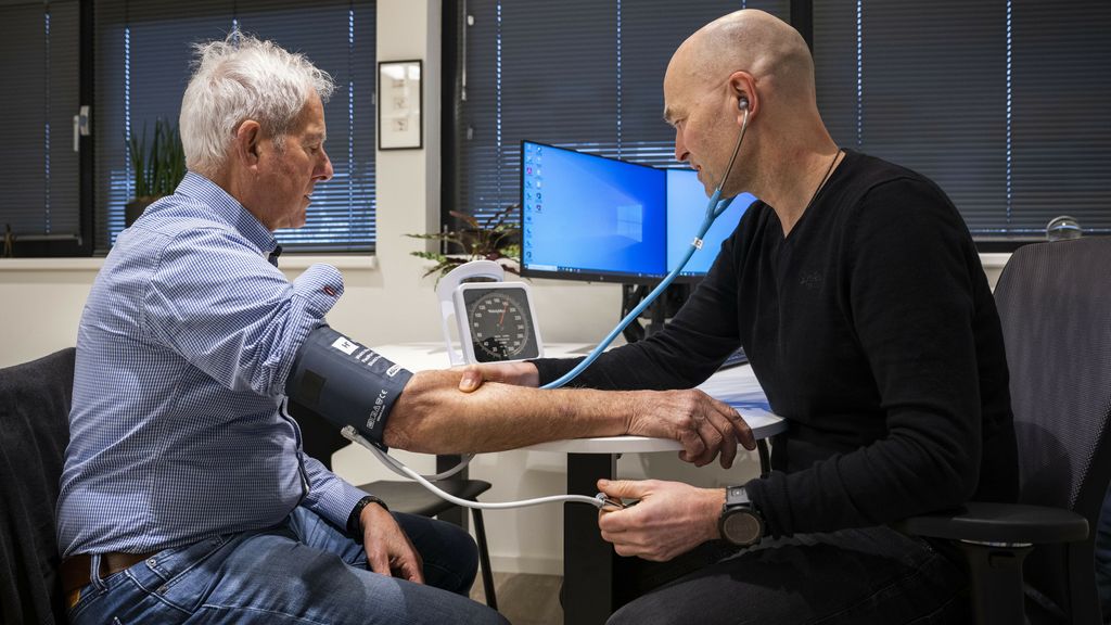 NOS | Jeroen van EijndhovenBloeddruk patiënt wordt door huisarts gemeten