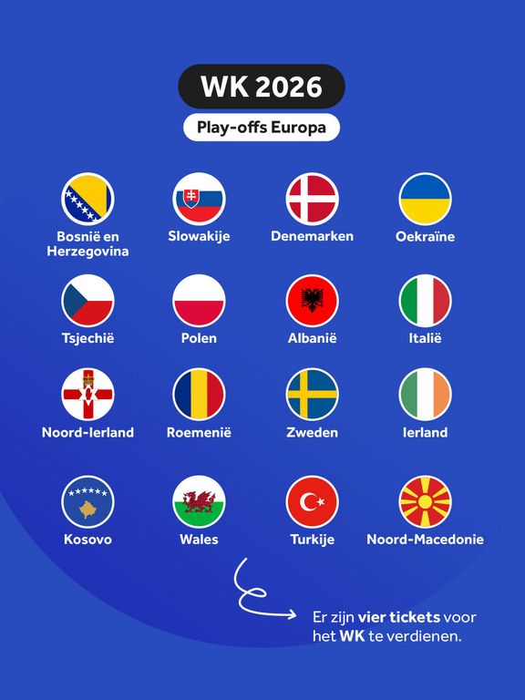 De loting voor de play-offs is aanstaande donderdag vanaf 13.00 uur in Zürich. De acht halve finales worden 26 maart gespeeld en de vier finales om een ticket op 31 maart.