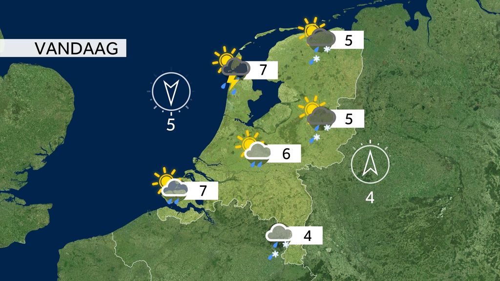 Eerst het weer: Het is buiig vandaag. Landinwaarts is kans op hagel en in het oosten mogelijk soms ook natte sneeuw. Het wordt 5 tot 7 graden. De wind draait van zuidwest naar noord en is veelal matig van kracht. In het noordelijk kustgebied staat er een krachtige wind.