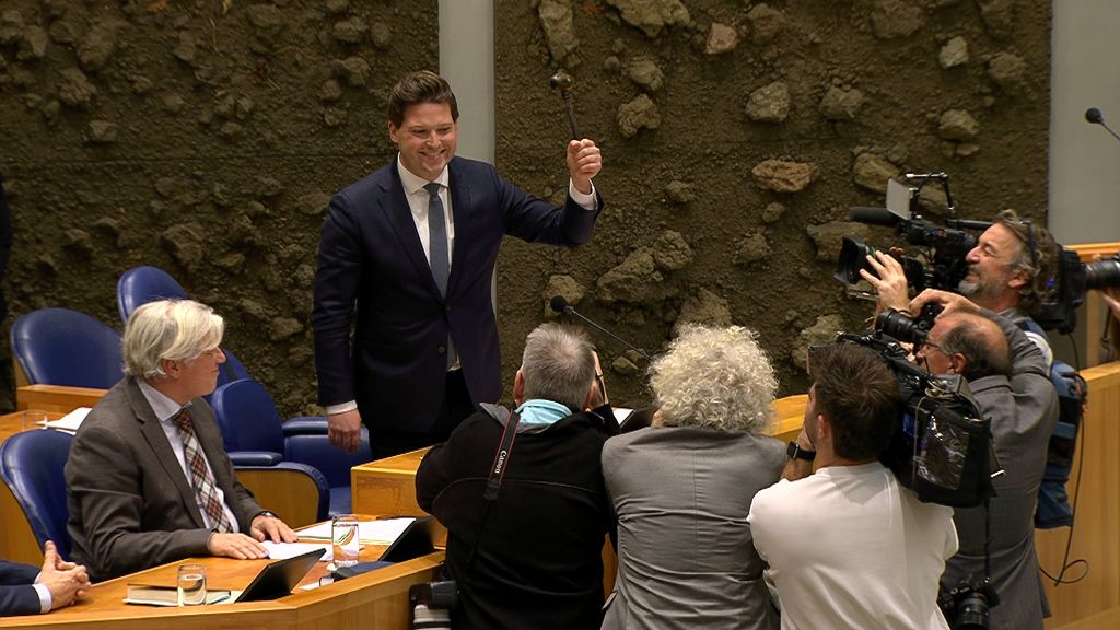 Geroffel en applaus voor Thom van Campen in de Tweede Kamer gisteravond. Hij is gekozen tot nieuwe Kamervoorzitter. In de derde stemronde kreeg Van Campen 10 stemmen meer dan de huidige voorzitter Martin Bosma. Hij nam de felicitaties en de voorzittershamer in ontvangst en gebruikte hem direct: