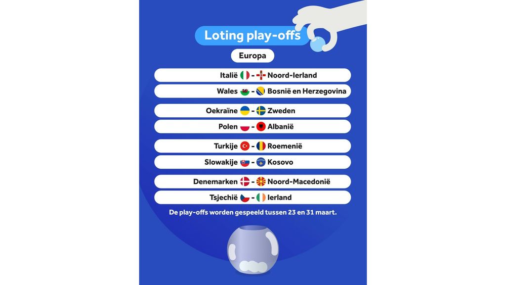 Ierland, dat de play-offs op spectaculaire wijze bereikte door een late treffer van AZ-spits Troy Parrott, speelt in de halve finales tegen Tsjechië en in een eventuele finale tegen Denemarken of Noord-Macedonië.