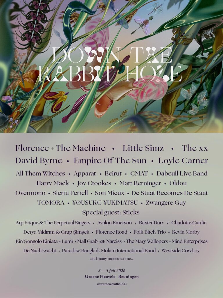 Nieuws uit Beuningen! Na een teaservideo op de socials presenteert Down The Rabbit Hole 2026 (een week eerder dan eigenlijk verwacht) een goedgevuld affiche. Naast bovenstaande namen maken ook David Byrne, Empire of the Sun en Loyle Carner hun opwachting op het festival.