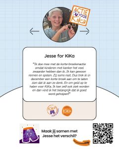 De motivatie van Jesse is simpel en eerlijk. “Ik doe mee met de korte-broeken actie van KiKa omdat kinderen met kanker het veel zwaarder hebben dan ik. Ik kan gewoon rennen en spelen. Zij soms niet. Dus trek ik in december een korte broek aan om te laten zien dat ik aan ze denk. En om geld op te halen voor KiKa. Ik kan zelf ook ziek worden en dan vind ik het belangrijk dat ik goed word geholpen.”