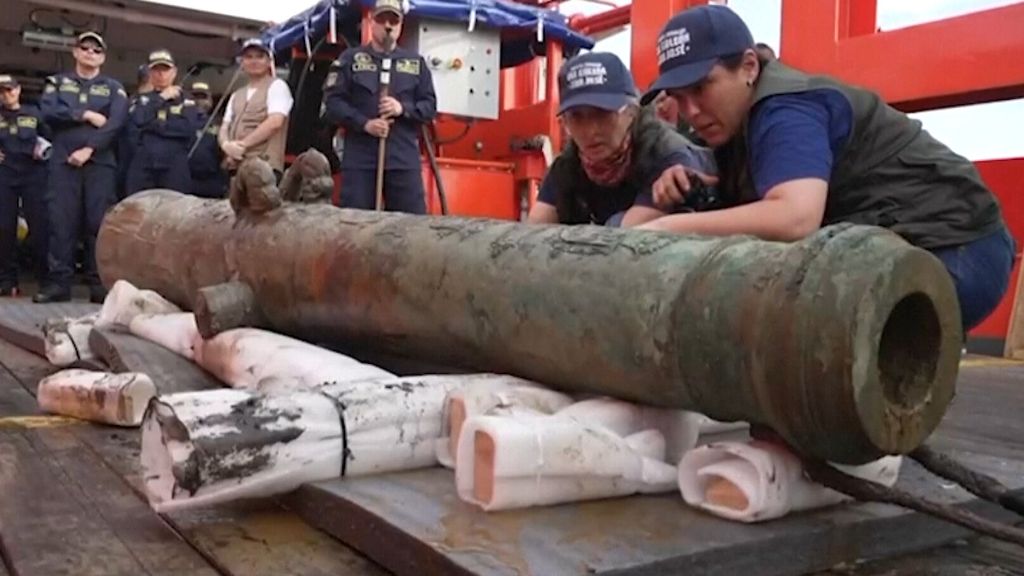 De eerste stukken die nu boven water zijn gekomen, zijn een kanon, enkele goudstukken en een porseleinen beker. De Colombiaanse president Petro was erbij toen de archeologen ze ophesen.
