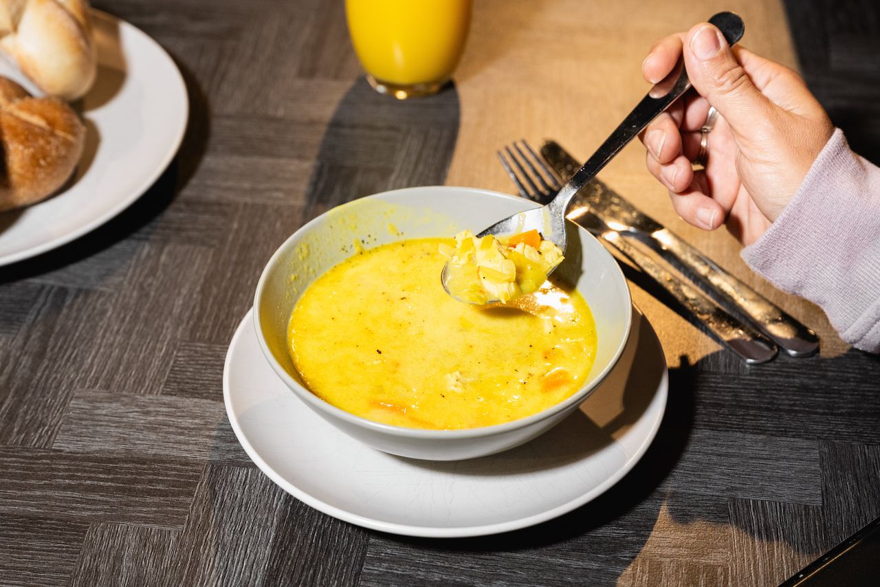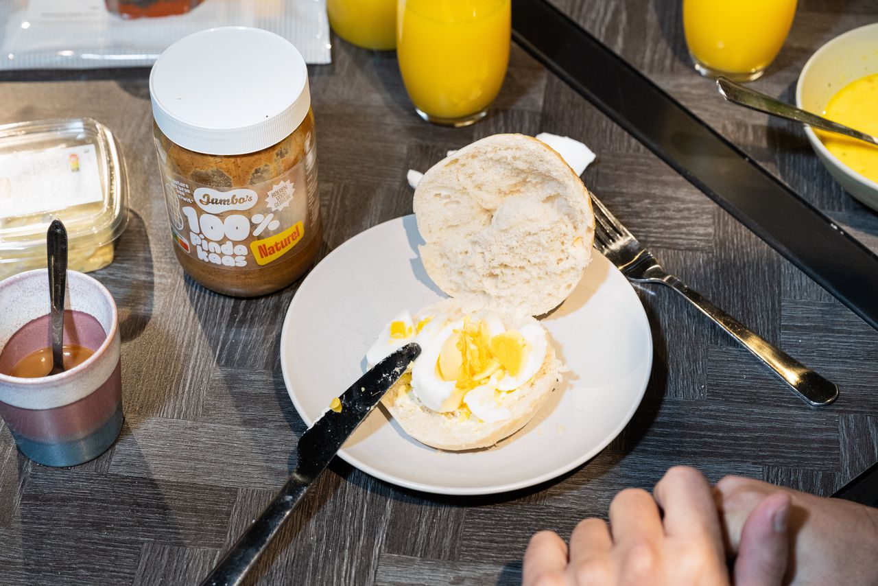 Collega Jan de Vries (47) komt de trap af. Vandaag werkt hij boven op kantoor, gister verkocht hij een badkamer: „27.500 euro, heel simpel model met twee toiletjes”. Allrounder Jan is ook de kok bij Grando Lelystad. Op de nieuwste inductiekookplaat met geïntegreerde afzuiging staat een grote pan luxe gebonden kerriesoep met kip. Hoe Jan aan het recept komt? „Ja gewoon, ChatGPT”. Uit de ijskast pakt Paul een literfles sinaasappelsap. Op de gedekte tafel liggen croissants, brood en eiersalade. „Jullie krijgen een luxe klantbehandeling, hoor”, zegt Paul. Op drukke dagen maken de werknemers meestal snel een tosti.