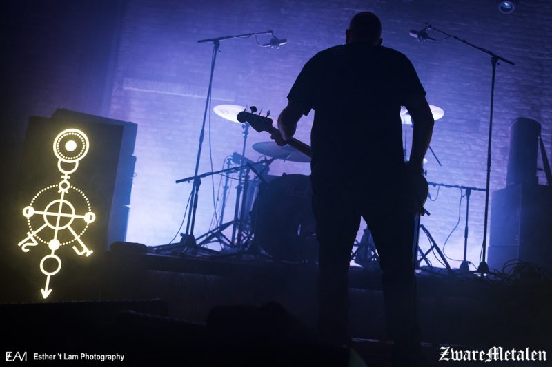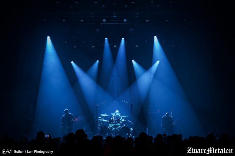 Eenmaal bij het derde gedeelte van de show aangekomen, raak je bijna in een soort hypnose. De band bereidt zich voor op het laatste vierluik, waarin ook duidelijk wordt hoe hoe goed de songwriting van Wiegedood is. Het podium kleurt felrood bij Doodskalm en De Doden Hebben Het Goed III, waarvan de riffs de rest van de dag niet meer uit mijn hoofd te krijgen zijn. Nu is de zang van Levy natuurlijk al goed, maar hij weet nog even diepe indruk te maken met een enorm langgerekte schreeuw bij Doodskalm. We zijn dan al anderhalf uur onderweg, de band blijft hoogtepunten afvuren. Niet dat ze daar zelf erg van lijken te genieten, overigens. De bandleden laten weinig tekenen van emotie zien. Vooral Gilles staat zijn partijen met een nonchalance te spelen alsof hij even de achtergrondmuziek voor een bingoavond in een willekeurige soos aan het spelen is. Het drietal laat verder ook niets merken, er is geen interactie met het publiek. En daar wil ik nog wel even een noot over kraken. Kijk: ik vind Wiegedood een wereldband, en er wordt vreselijk goed gemusiceerd, maar ik word onderhand heel erg moe van geen interactie. Van dat navelstaren, waar die hele Church of Ra-kliek patent op heeft.