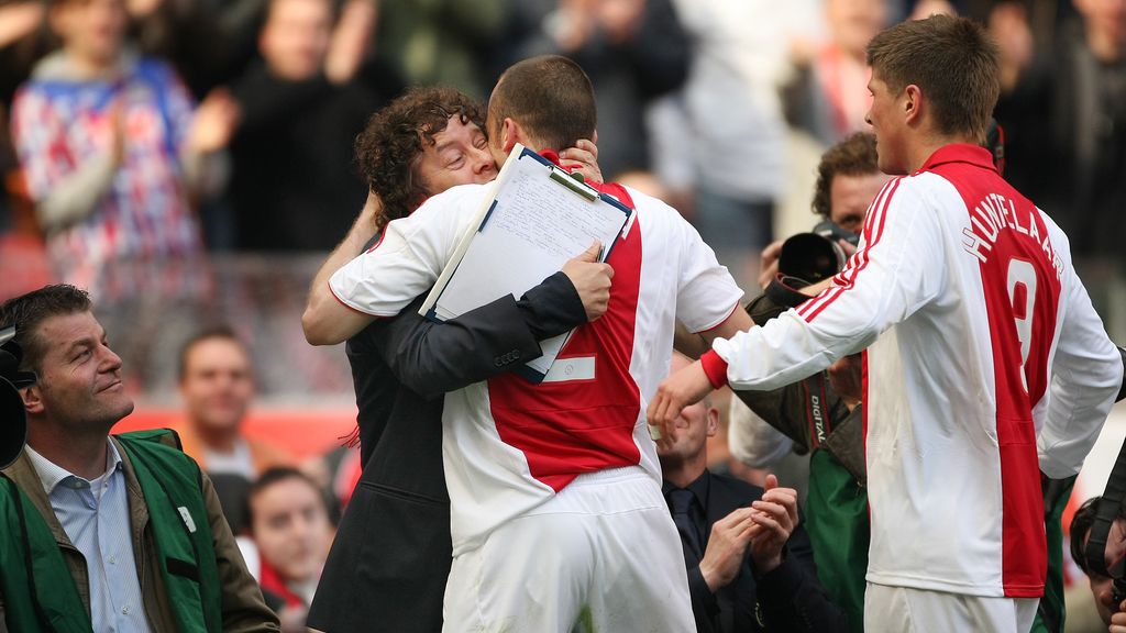 Pro Shots2008: Teammanager Endt omhelst speler Heitinga, die later als Ajax-trainer veel kritiek kreeg in de pers