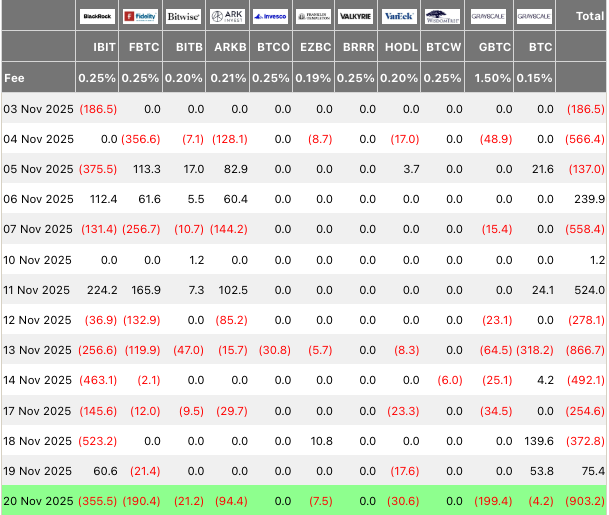 Donderdag stroomde er 903 miljoen dollar uit Amerikaanse Bitcoin-ETF’s, wat volgens Farside Investors de grootste uitstroomdag van november is. Ook behoort dit tot de grootste uitstroomdagen sinds het bestaan van deze producten. De totale uitstroom voor de maand staat inmiddels op 3,79 miljard dollar en heeft daarmee het oude record uit februari al gebroken. Als de resterende dagen geen herstel brengen, wordt november de slechtste maand tot nu toe voor Amerikaanse spot Bitcoin ETF’s.