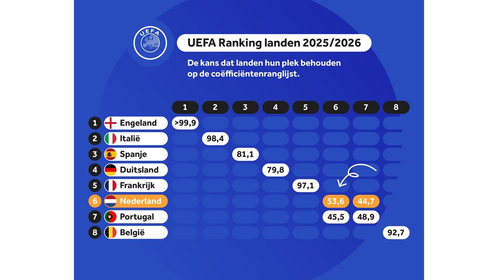 De kans dat Nederland de zesde plek vasthoudt, werd aan het begin van het seizoen op 79 procent bepaald. Inmiddels is de kans nog maar 53,6 procent en is er een kans van 44,7 procent dat de eredivisie daalt naar de zevende plaats: